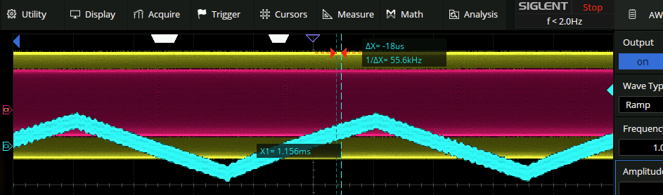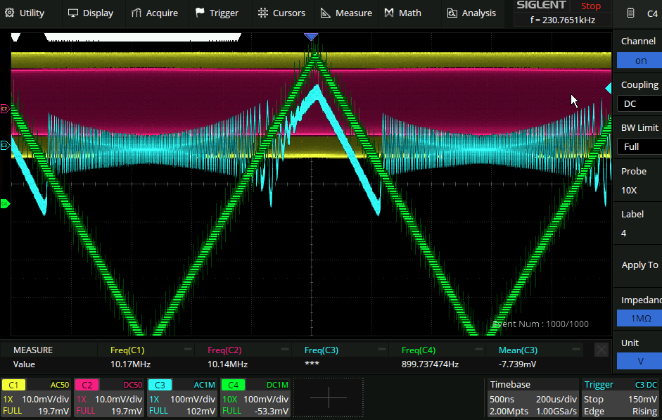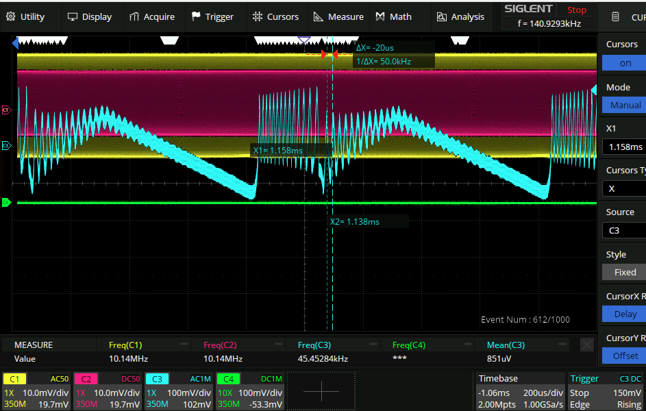 So close! It looks like the PLL can’t keep up for some reason and looses the lock. Blue and green are on the same volts/div, although blue is AC coupled. Adjusting thing slightly we can see that when the PLL loses the lock the error signal is around 50KHz: