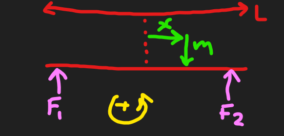 I’ve put the origin in the middle here cause we are about to take the sum of the moments and idk what to do about that when the distance is 0 there. Eqn 1: Which leads to: Blah blah blah I’m sure you can reduce this to an exact solution. Two equations and two unknowns and all that.