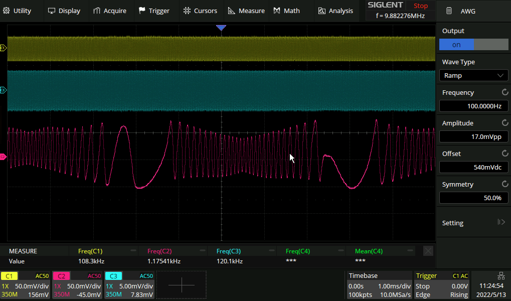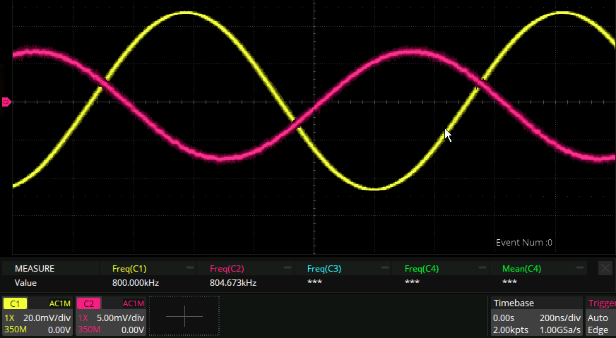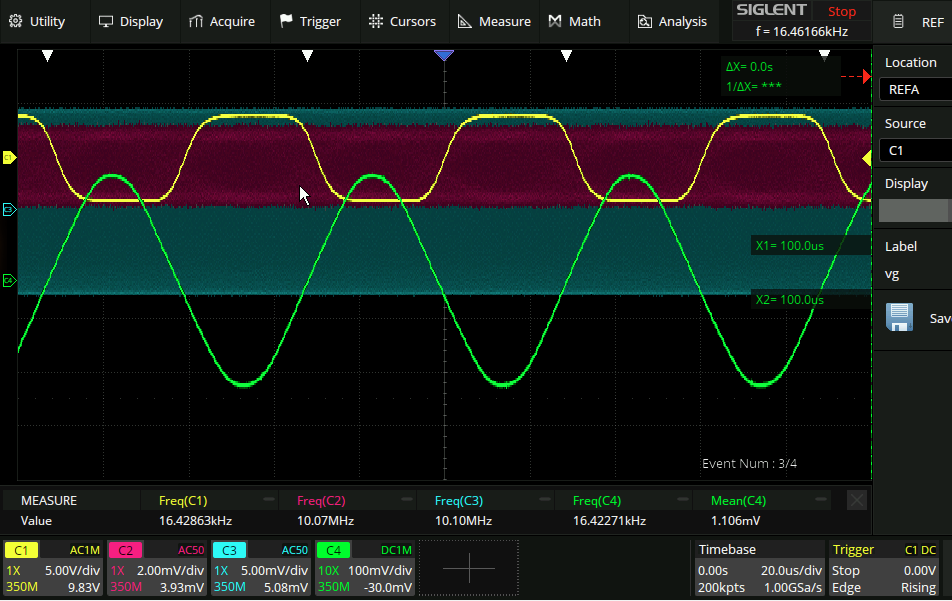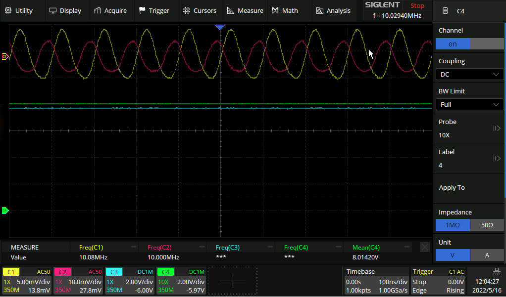 Situation: control loop switch is open. Channel 1 and two are the RF and LO signal respectively. CH3 is the VCO voltage, about 7.5V. CH4 is VCC (7.97V) V_lo = 1.395V, V_ The circuit is like this: