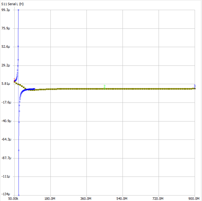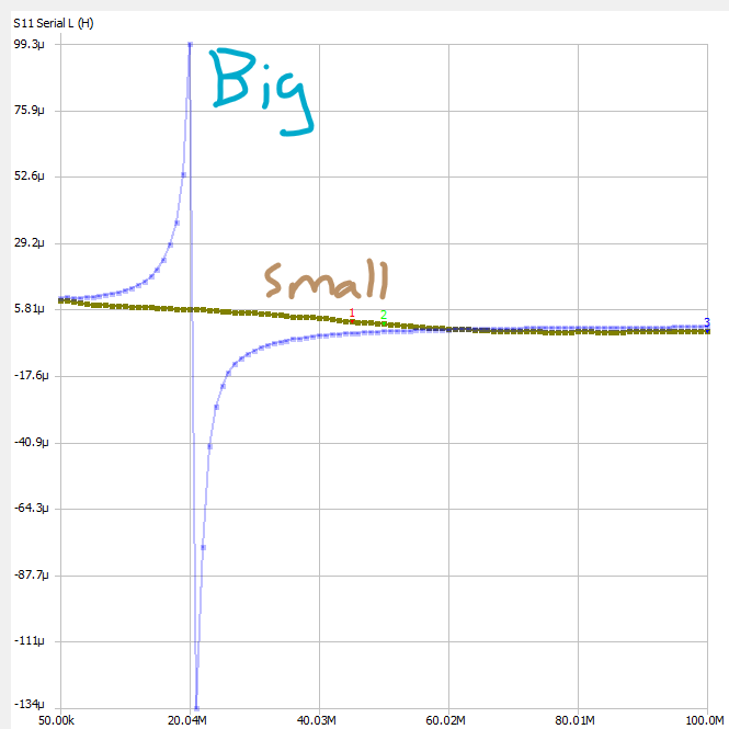 It’s unsurprising that the small inductor works better at higher frequencies, but it’s a bit surpriing that it works that well. Both inductors measure about 10uH at 50kHz.