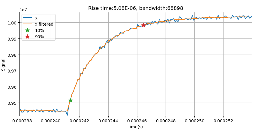 Max F dev: 6.05e5. Min: 2.8e4. ⇒ 90% = 5.47e5. 10% = 8.5e4 t_90: 1.493ms, t_10 = 1.544ms. ⇒ Bandwidth = 0.35/(1.544e-3 - 1.493e-3) = 6.8KHz. This would seem rather too low. That’s with a 50k. Resistor. Should go back to 10.7kOhm 10.7kOhm leads to 68kHz bandwidth: