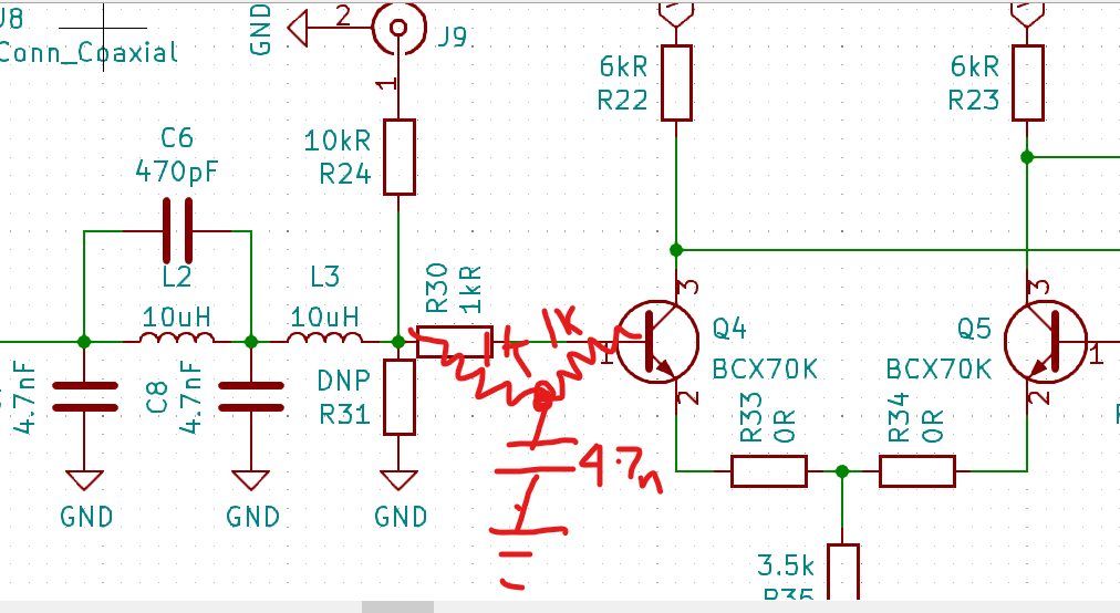 The current should be around 25mA. R3 is 100R and I measured 1.382V ⇒ 13mA. Seems quite low! The quiescent current of the JFET seems roughly similar to the working set so I think it’s most likely the C4/C5 values that are off, and I don’t know what the right ones are. Time to use the VNA!