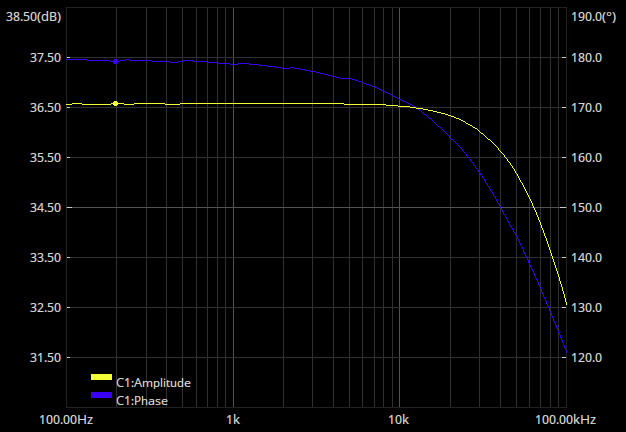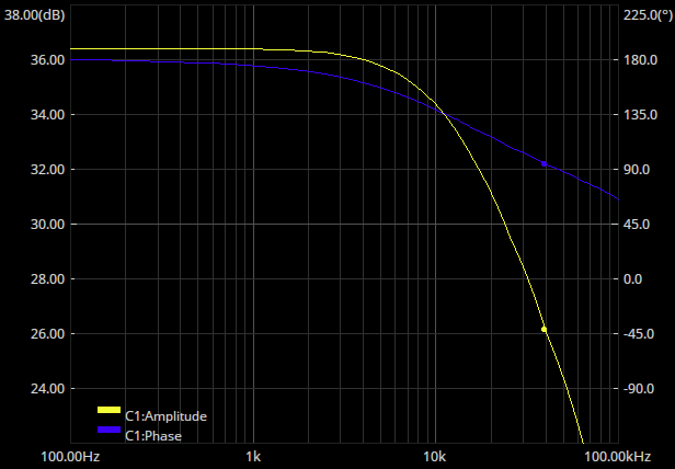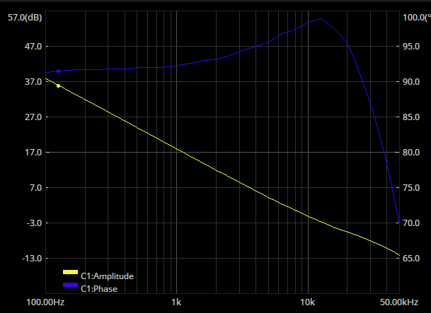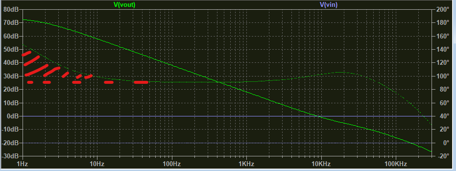 Looks vaguely the same, exept that the phase shift component from the 10Meg resistor is missing. Suspicious… I’m also a bit worried that the phase shift goes up by a fair bit before the amplifier crosses zero gain. The textbook says it should look like this (I think):