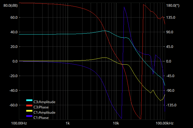 Where C3 is the passive filter + diff amp and C1 is just the passive filter. The output crosses 0dB gain at about 30kHz and is at ~-10dB at 60kHz so hopefully this will be good enough. If this doesn’t work then reducing the rather large gain of the diff amp would be a good next step.