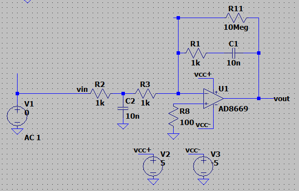 The red shaded area above is due to the 10 Meg resistor. Here is the bode plot:
