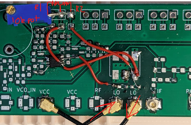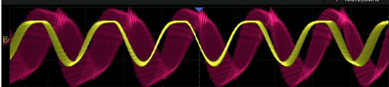 Works great. With this amplifier I can get the PLL to lock with a whopping 1.5Vpp input, up from the previous [410mV](^744b71). I think this is satisfactory for the overall design. You can see that the VCO (CH2) is close to its limit: