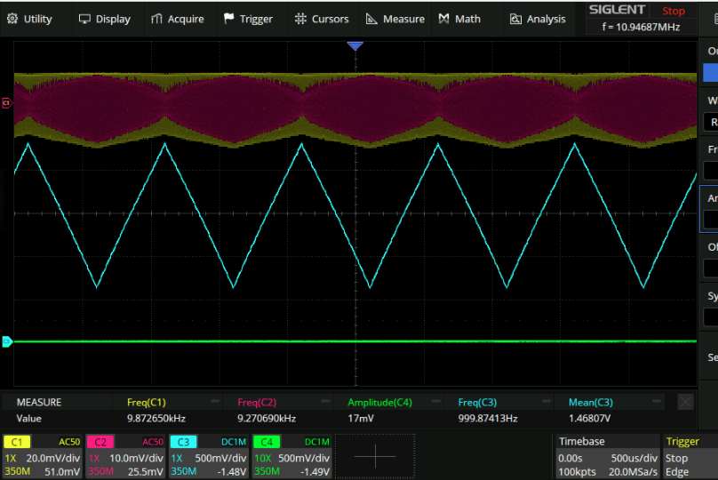 Any higher frequency and it would stop oscillating entirely. CH3 is the input to the VCO. Notice how it requires an offset. The amount of offset required increased with the modulation depth. This seems like it could be to do with maintaining a more constant % modulation.