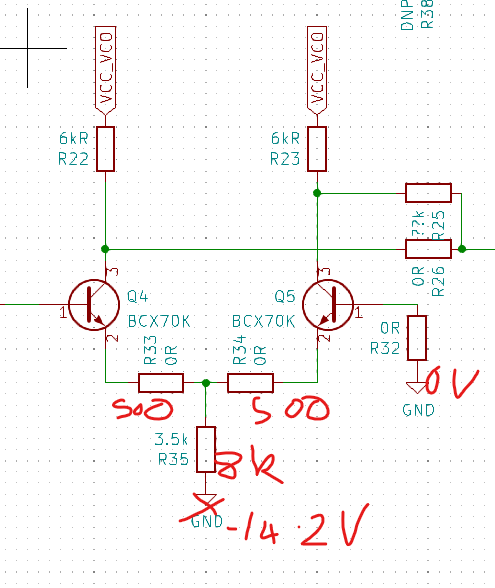 I have adjusted the voltage of Q5base to be at ground and then adjusted the supply voltage so that the output is centered at ground too. This required a supply voltage of -15V, but we can just decrease the resistor there later and that should be fine.