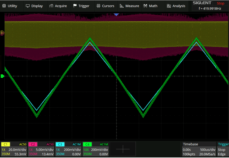 Interesting difference in the response on the ramp up vs ramp down. And the wiggles on the ramp up seem to pretty persistent - you can change the input waveform frequency and amplitude, and get much the same response.~~ Actually all of the above is garbage cause I was not probing the proper input. Whatever, it looks good to me. On to measuring the actual amplifier.
