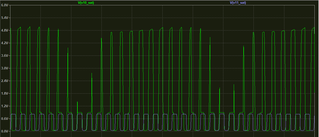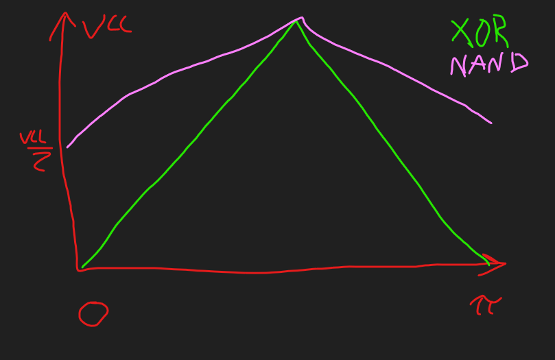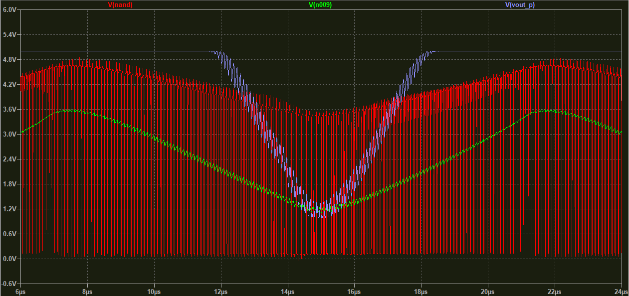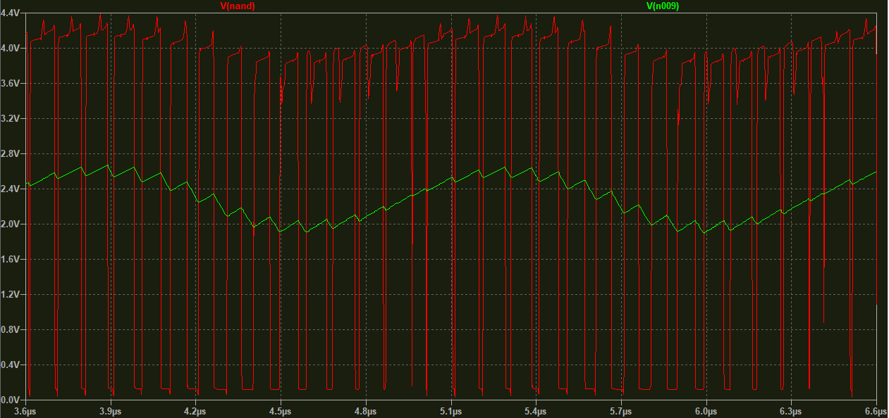 The second one isn’t very high amplitude cause it’s going straight into the base of the bottom transistor. The NAND output looks like this: