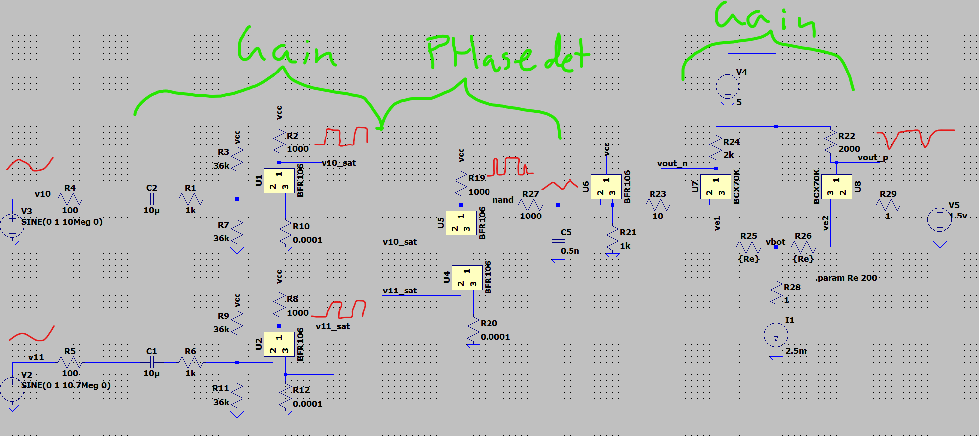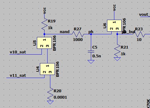 The two input transistors are responsible for providing a bunch of gain to make the output a nice big square wave. That goes into the NAND phase detector, which then goes into a diff amp. The saturated output of the first gain stage looks like this: