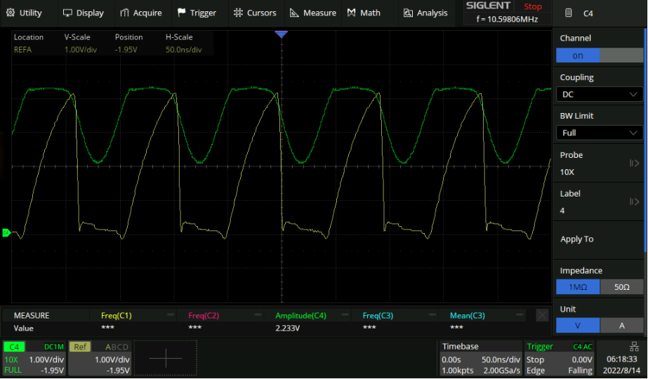 Probing the collector of U1 above is a bit tricky by default for a 10MHz signal. Even 10pF of capacitance changes the output quite a bit, and a cable can have 100pF+! So putting a 50kr resistor out from the collector of the transistor and 50R terminating at the scope gets rid of the vast majoraity of the capacitance. The signal amplitude isn’t too bad either since it was originally 5vpp.