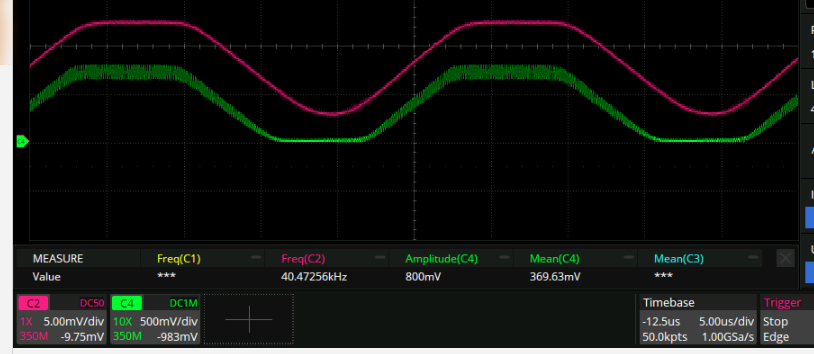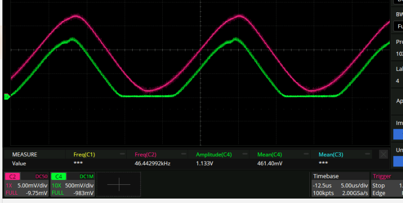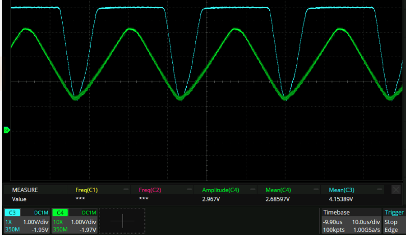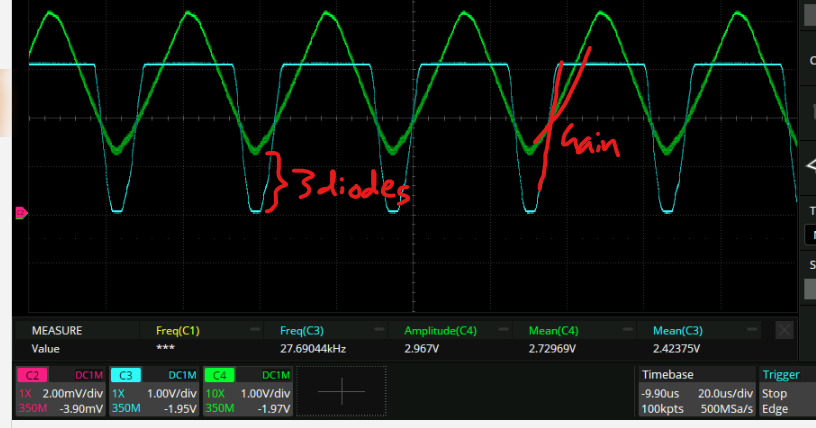 Where green is the vout_p node and blue is the vout node. I think this means that it’s ready for prime time in a loop! (A crude measurement indicates it has a 150kHz 3dB bandwidth. This actually seems to be limited by something upstream. Gee, that wouldn’t be R27/C5 would it?)