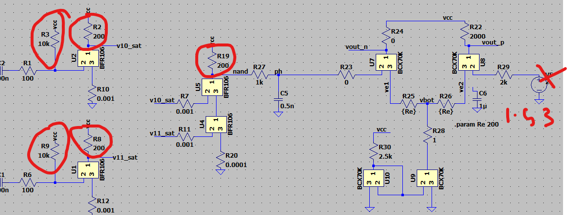 - Increasing the bias on U1/U2 so that they have lower output current into the NAND gate. The whole biasing scheme of these tranistors seem bad but I applied the heat gun and nothing much happened.