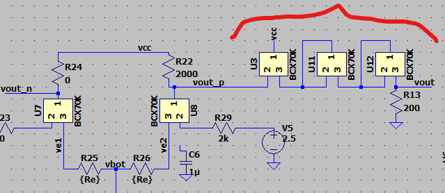 The output of the buffer (REF1) has too low of a duty cycle. I attribute this to the output of the buffer having too high of a duty cycle, and that being because it’s hitting the rail. So I should reduce the biasing on the base of that transistor. Because this transistor is intended to operate rail to rail (high gain) I think we have fallen into the trap of having a circuit that depends on a particular value of transistor gain. Maybe biasing all the amplifiers with current mirrors would work well, like this: