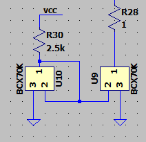 Remembering that according to the ebers-moll model of a transistor the collector current of a bjt is programmed according to the base-emitter voltage of the transistor. R30 sets the collector current of U10 (and thus also it’s base voltage) and then the base voltage of U10 is connected to U9’s base, thus also programming it’s collector current, the currentwe actually care about. This seems to work pretty well: