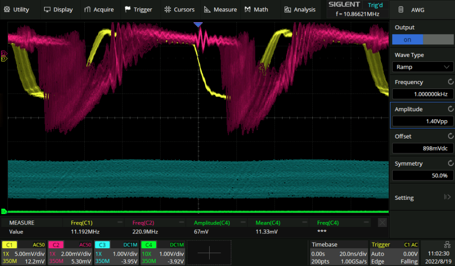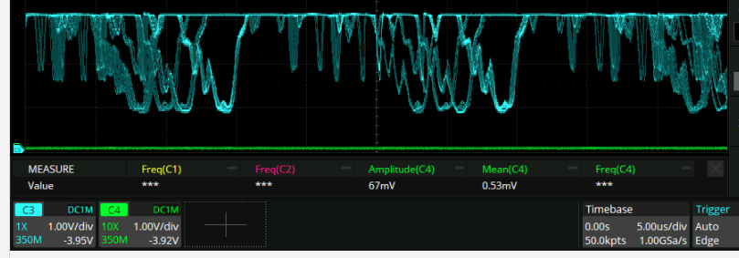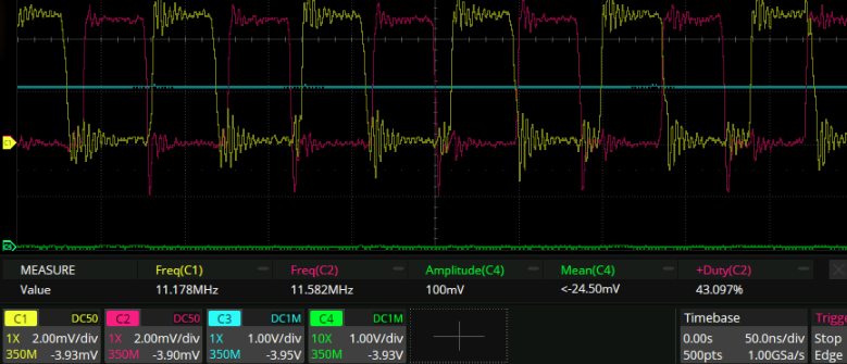 The above are the two buffered outputs with the 1000:1 divider. There is a 43% duty cycle that’s basically independent of LO frequency! I used these values to do the baising: