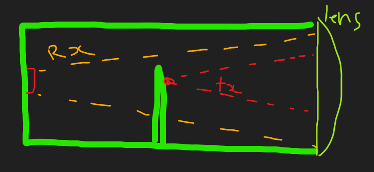 One of the main problems here is going to be close range detection. I’m not sure how to get around this one. Perhaps some kind of baffling can be made between the tx and the rx to get the crosstalk down to an acceptable level. Failing that maybe a second tx lens, although that’s quite undesirable from a complexity/size/alignment/general terribleness POV. I don’t think it would be a good idea to go to an ADC and try and subtract out the waveform. That would require expensive electronics that would prolly consume 1W+ and make it infeasible.