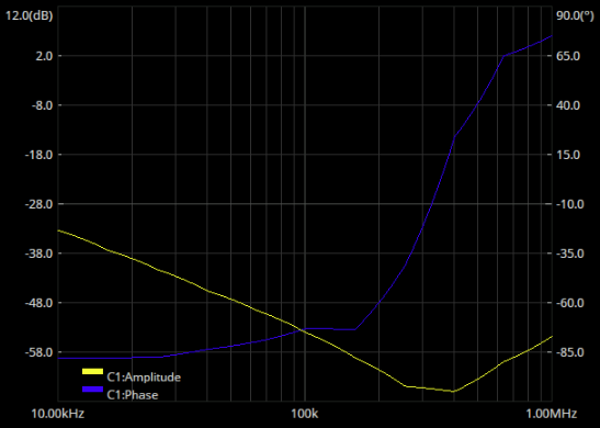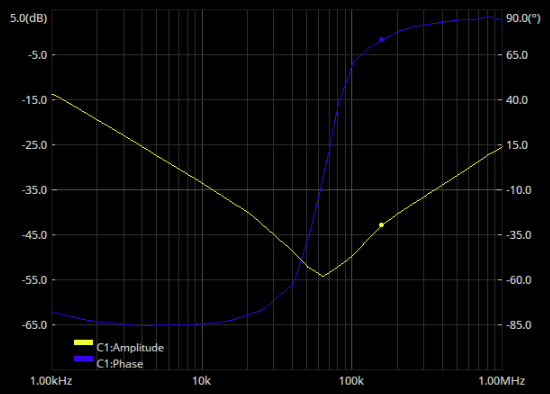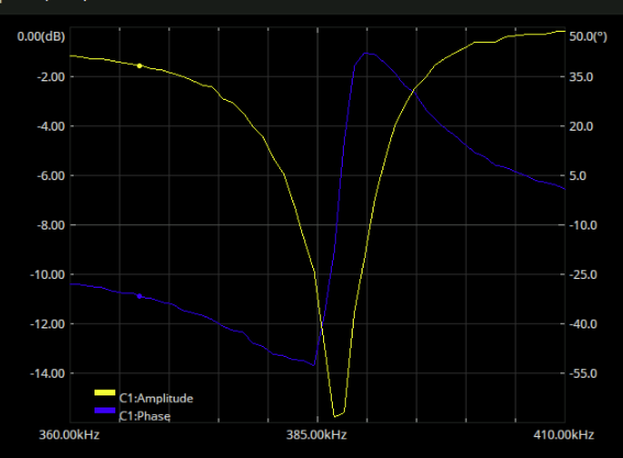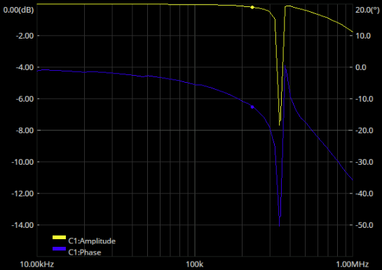 When we do a frequency sweep there should be a sharp drop in amplitude measured by the scope. Fortunately this seems to have worked great, here’s a bode plot from the scope of circuit B: