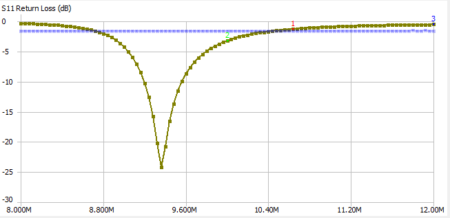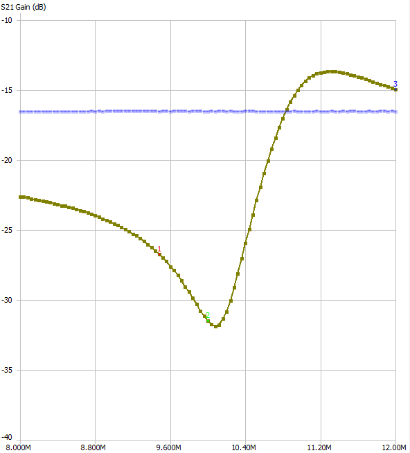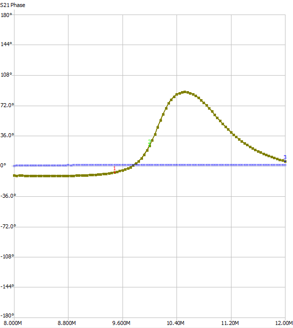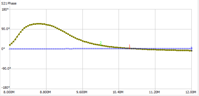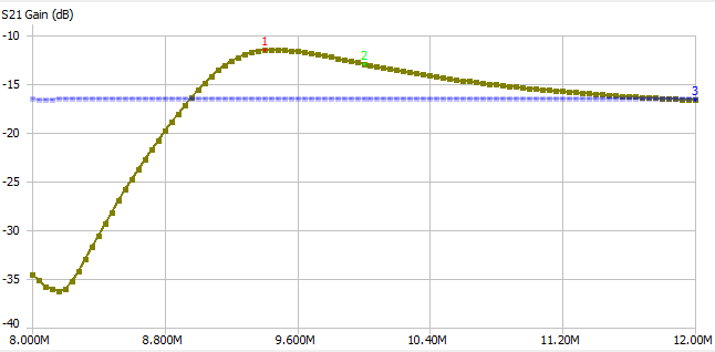 Regardless it looks like the max gain is +5dB at 9.48MHz, and overall I think the plots more or less make sense. The gain is >0dB (but not by much) and the phase is close to 0 degrees (but varies wildly).