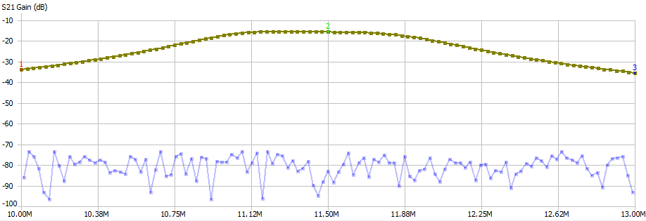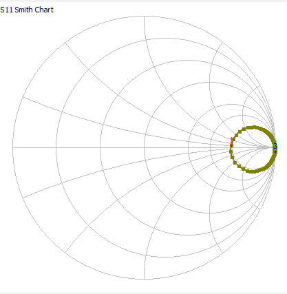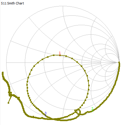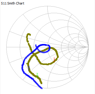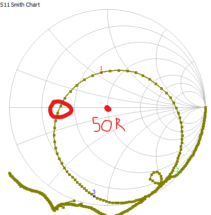 I believe on the smith chart where the trace crosses the horizontal axis is where the impedance is purely real (what we want, I think). This is actually pretty close already to the best S11 loss (denoted by the red 1). Deviations along the horizontal axis are away from 50R but I don’t think we care about that so much since we are making our own amplifier anyway.