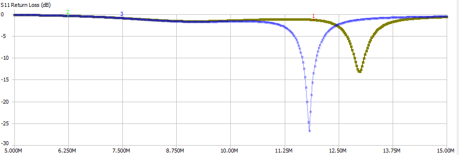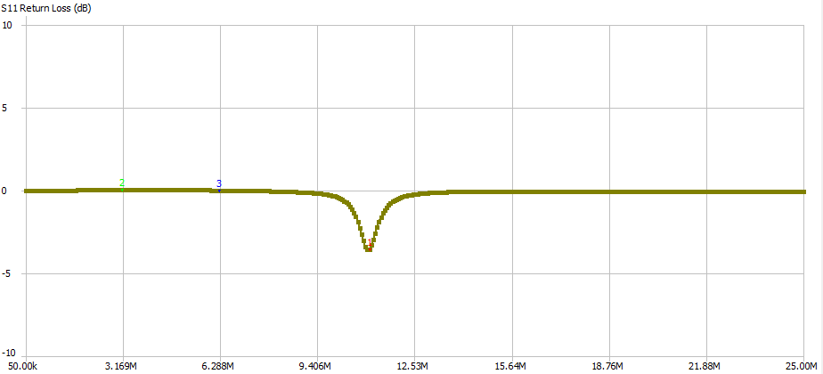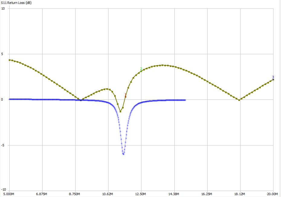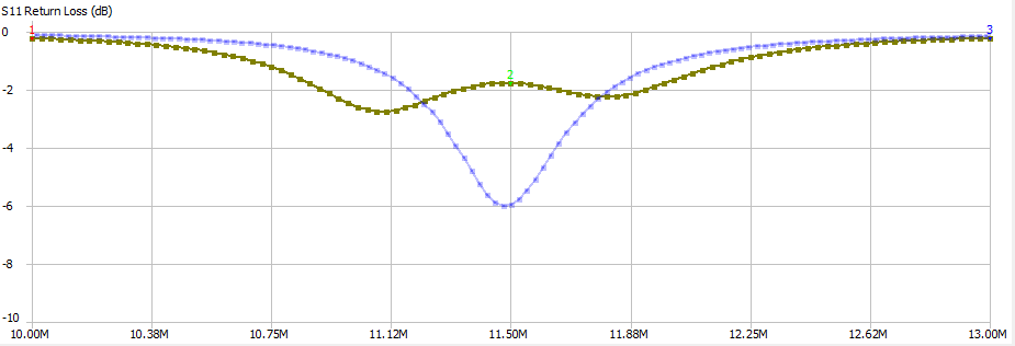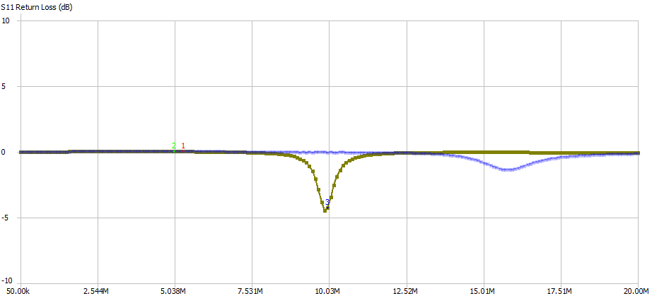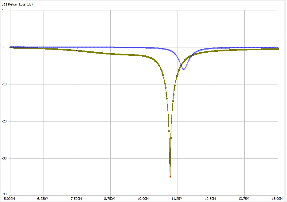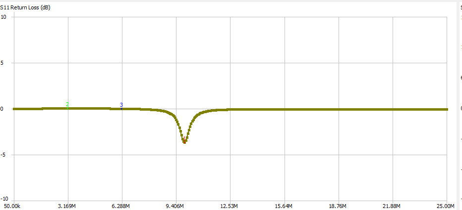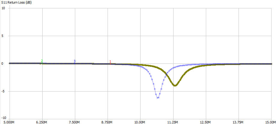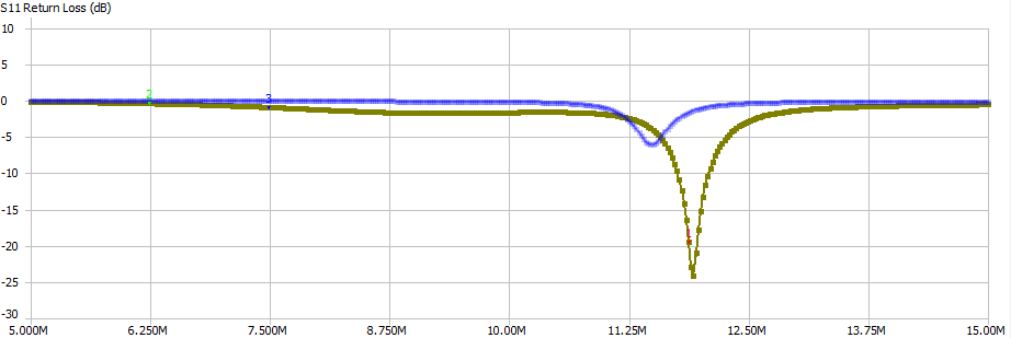 welp that just moved the resonant frequency down to 9.8MHz and did nothing to the S11. Not that surprising really.