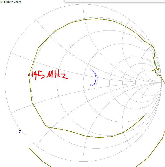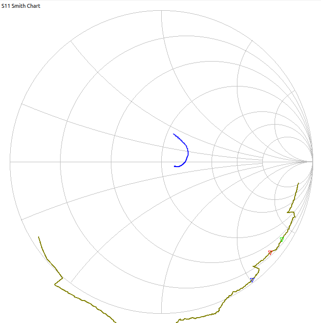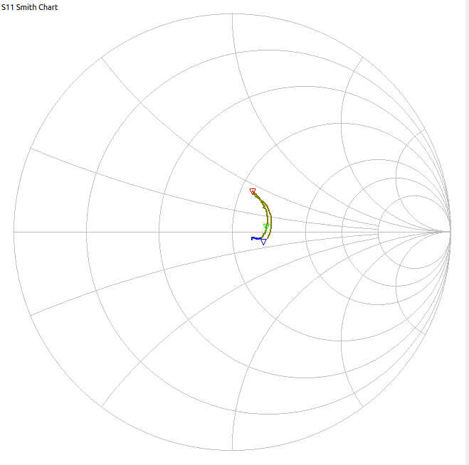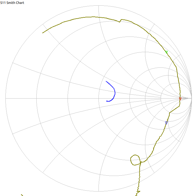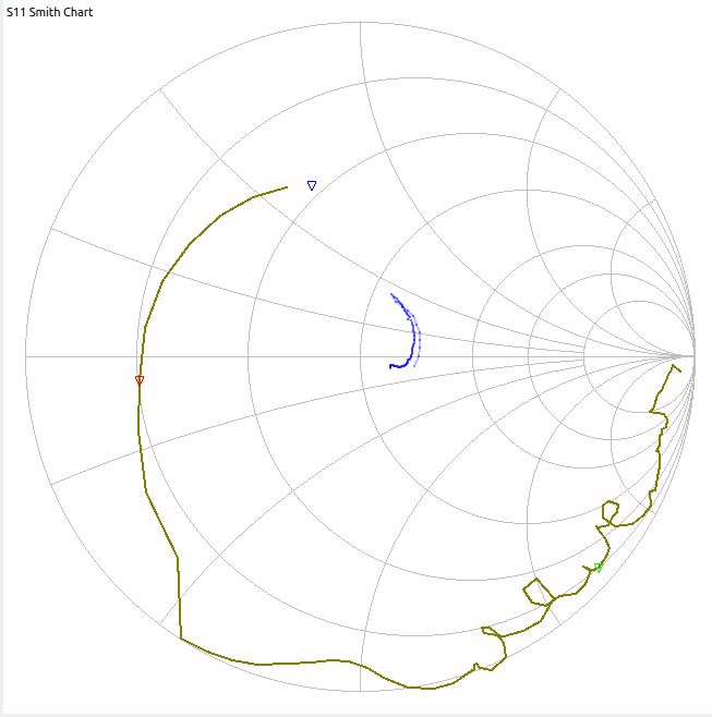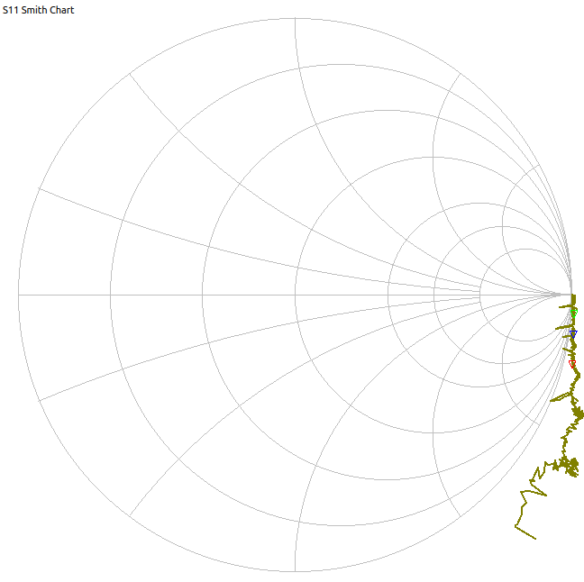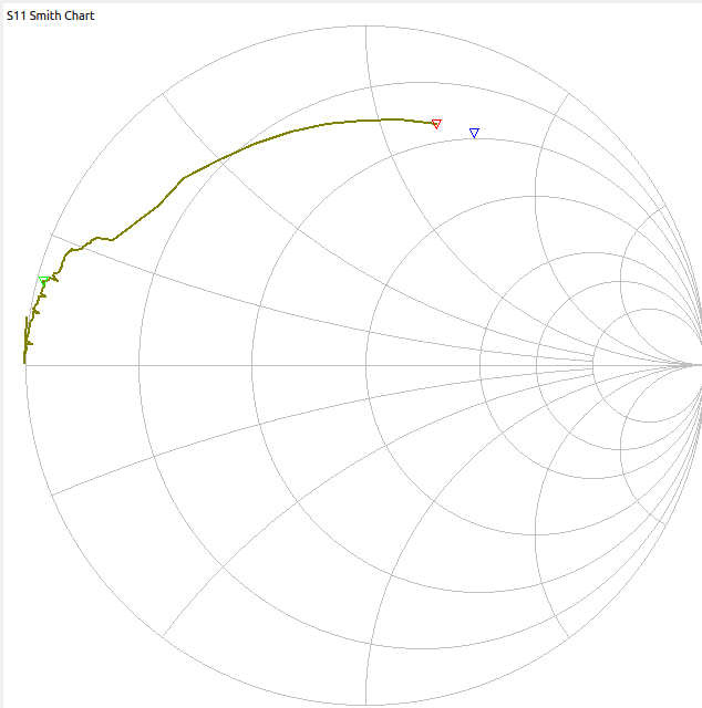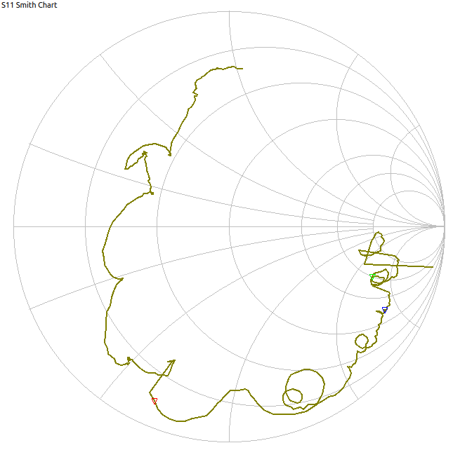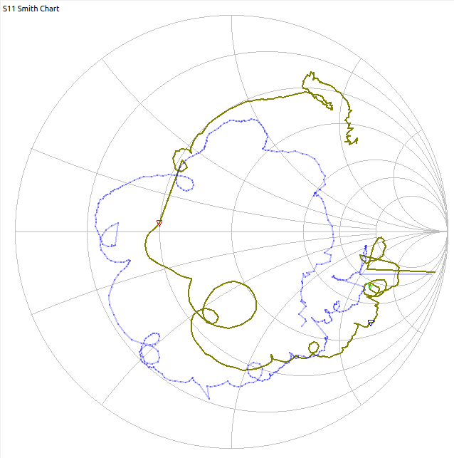 Which is quite a bit worse. The S11 smith says that the input impedance is 55+j20R. I’m not sure but that sounds pretty close to 50, sufficiently close anyway that the 20dB performance gap is not explained by it.