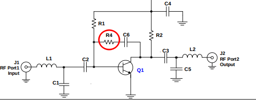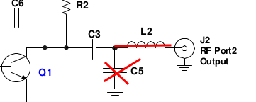 I’m assuming this looks bad from terrible output matching. From a plain no-parasitic no-nonsense reading of the schematic the amplifier should have an output impedance of R2+R3 == 100R ish which doesn’t sound so bad. So I will remove L2 and C5 from the schematic: