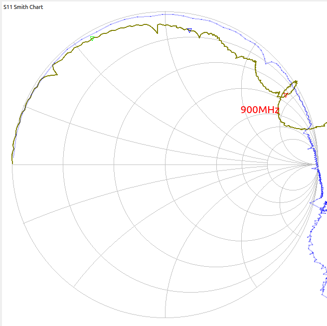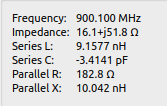 Regardless the impedance is 10-j2.6R. So First off I need a 40R inductor. That’s 40/(2pi900e6) = 7nH apparently. Soldering that on did not lead to much of a change. The impedance of this component directly to ground on a separate test board is this: