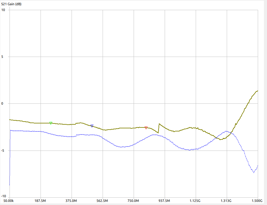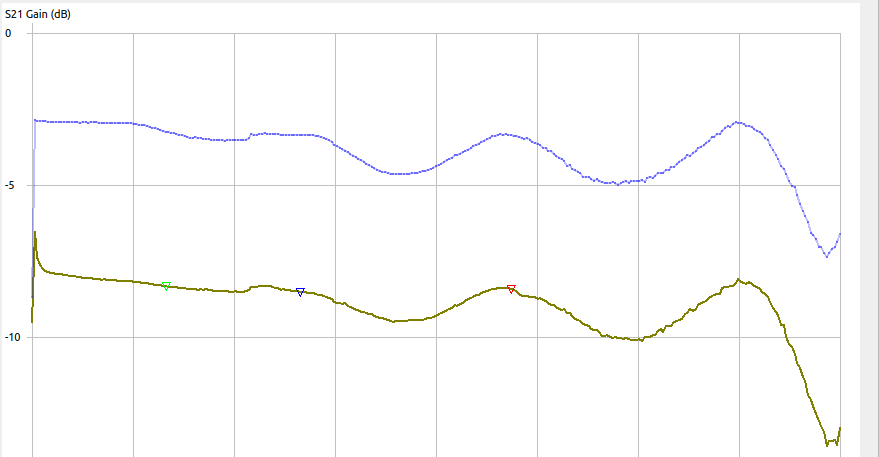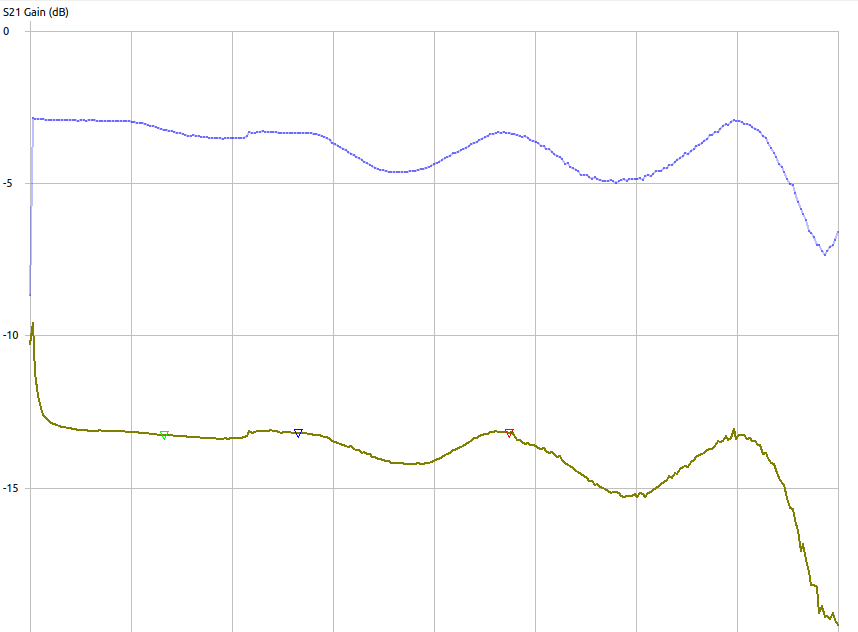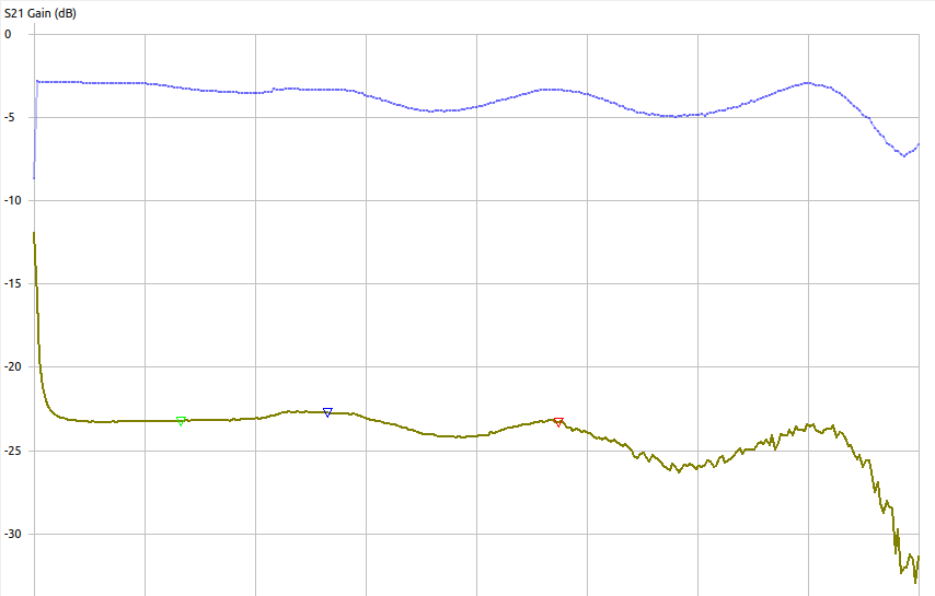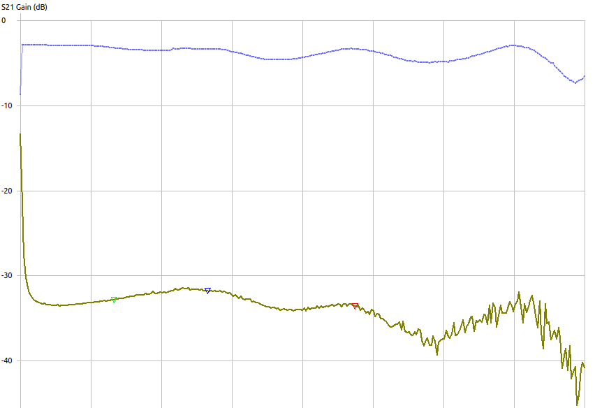 The top line is reference 0dB attenuation going through the attenuator. It’s wiggly I think mostly cause I didn’t bother to do a proper cal.