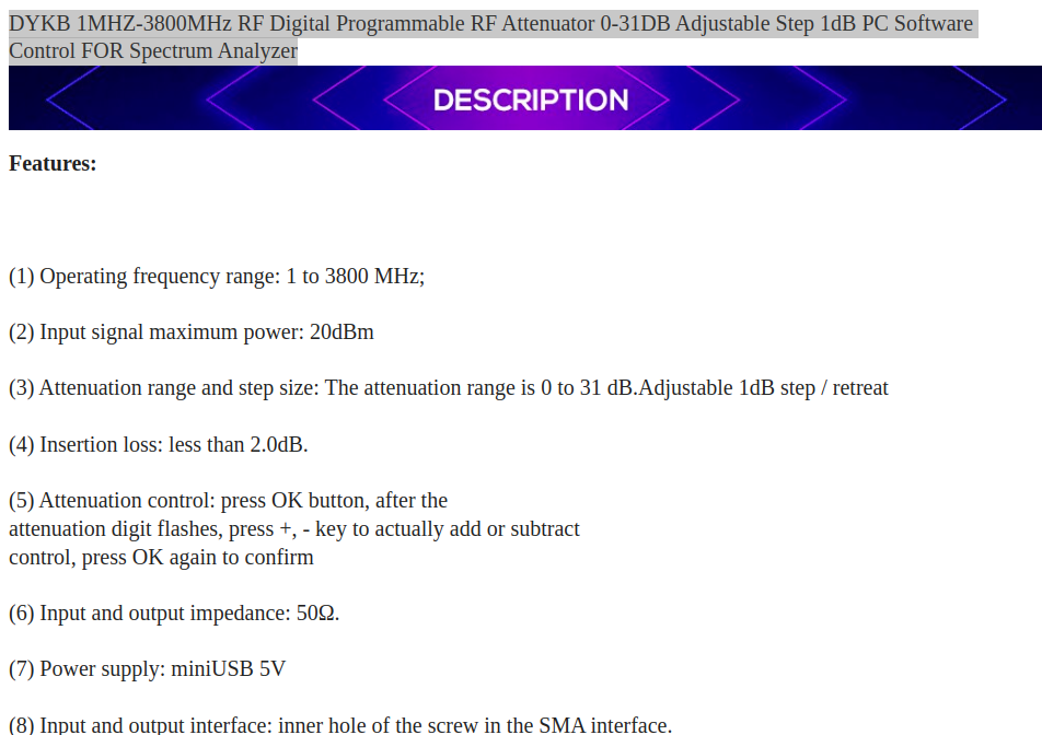 DYKB 1MHZ-3800MHz RF Digital Programmable RF Attenuator 0-31DB Adjustable Step 1dB PC Software Control FOR Spectrum Analyzer