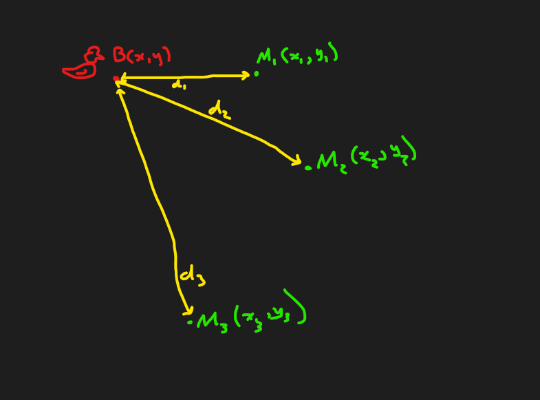 Remembering that distance is the same as time here what we observe in this case is that microphone hears something, then , then . So the input to our system/our observation is . Call the microphone array . Since we know the positions in M I do believe we are one linear equation away for writing down the location of the bird which one can solve in a least squares fashion in numpy.