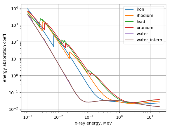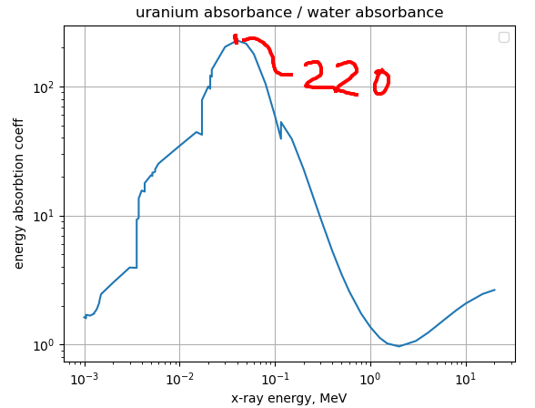 Mice are mostly made out of water, and it seems that the heavier the element the better. So let’s do uranium vs water. Here is a plot of the energy absorbtion coefficients of water an a couple of elements spread over the periodic table: