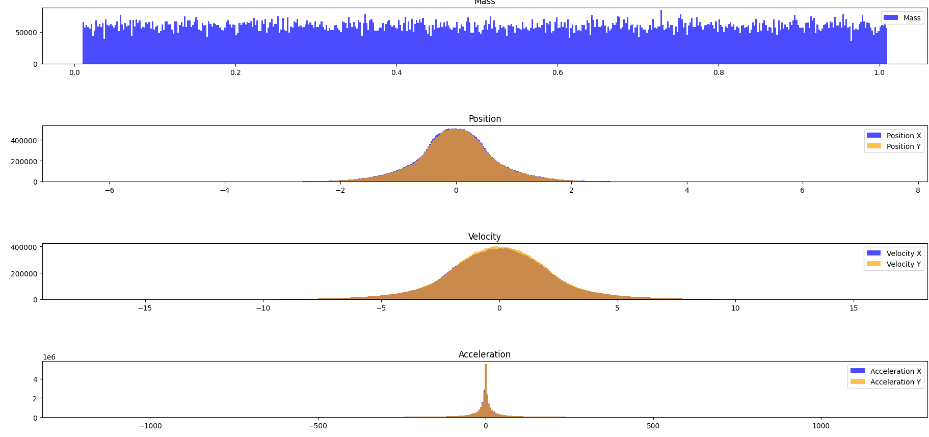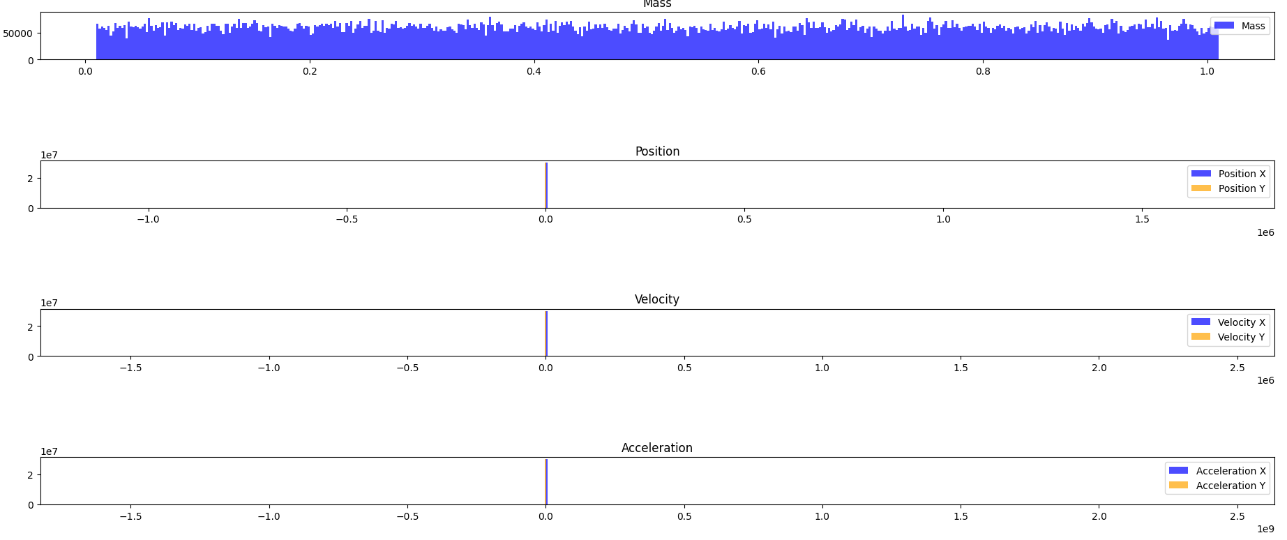 Which looks significantly more intelligble to me. There is a paper which I have read all the way through and downloaded the source code for etc, and one of the things that they did was actually train the net to predict only the accelerations, then use a simple to actually calculate the positions. This intuitively makes sense here because it is indeed the forces on the particles that we are actually trying to calculate, but it also does not make sense to me because if you look at the statistics of the accelerations above, the acceleration is extremely high variance. Maybe we should try and predict the log of the acceleration?