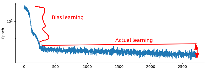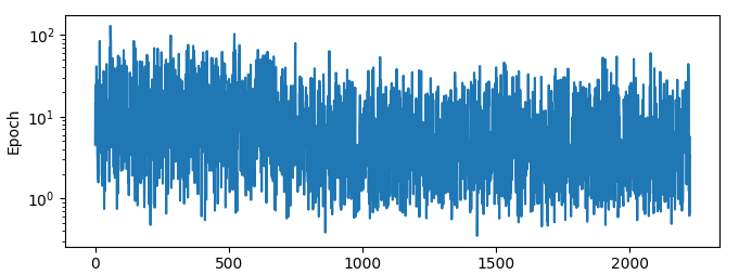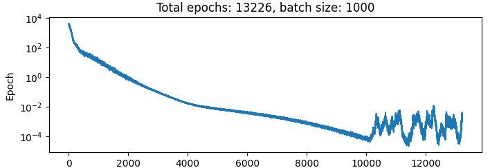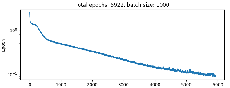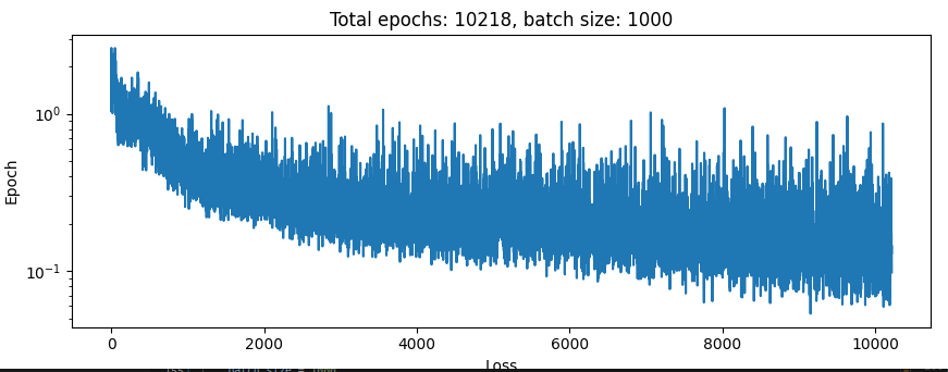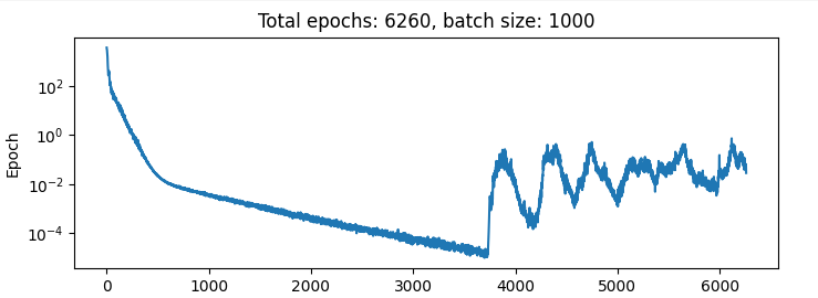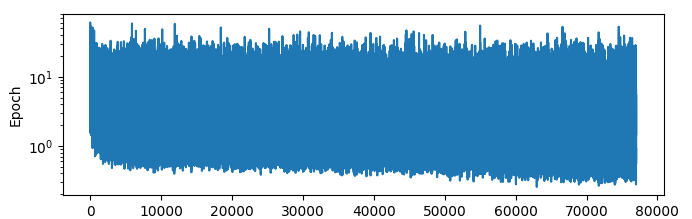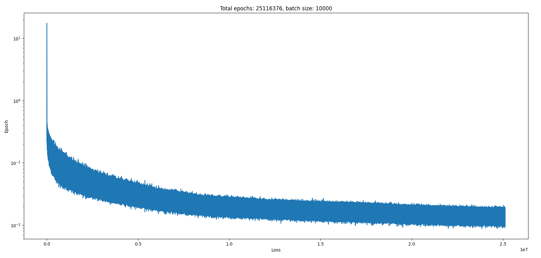 return x.reshape(orig_shape)For a bit over a day and got 25e6 epoches with a batch size of 1000. So 1e10 forwards passes of the net, which took about 24 hours. Learning rate of 3-e4, naturally. Here is what the loss function looks like: