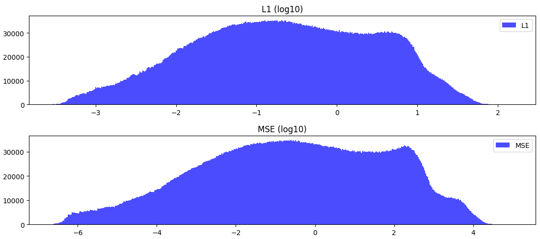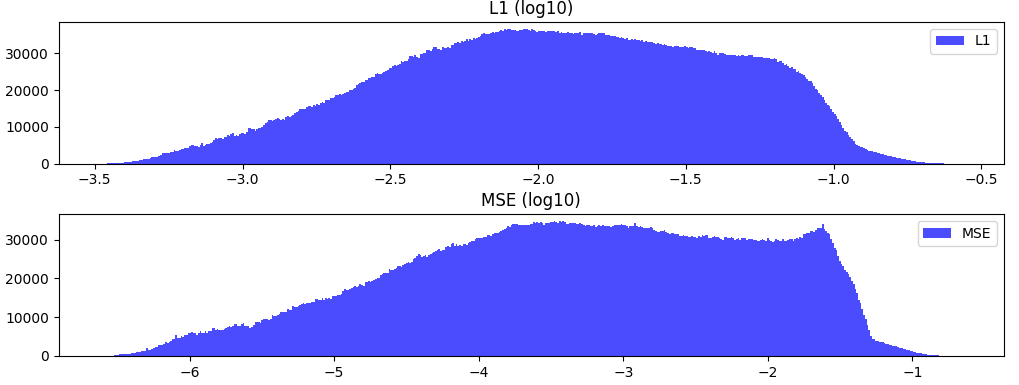 We have looked at the state statistics before, but what about the loss statistics? Here are the L1 and mse losses for a single step of the simulation: