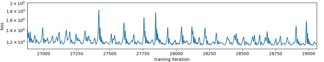 I wonder if there are any schedulers that attempt to maintain a constant variance (in log space) in the loss function. To me that sounds like a good way to get a signal about how big of a step size to take in the gradients. Wait no that makes no sense. As the model trained the loss function variance would not decrease. I guess maybe this works to find a good learning rate rather than to adjust it over time. The loss functions is most definitely not a random variable though, here is the loss over time zoomed in to the middle of the above training run: