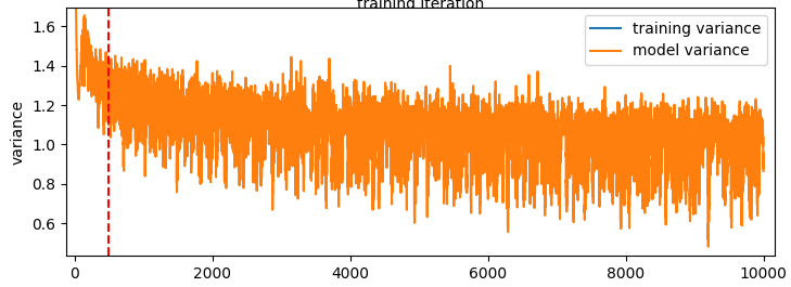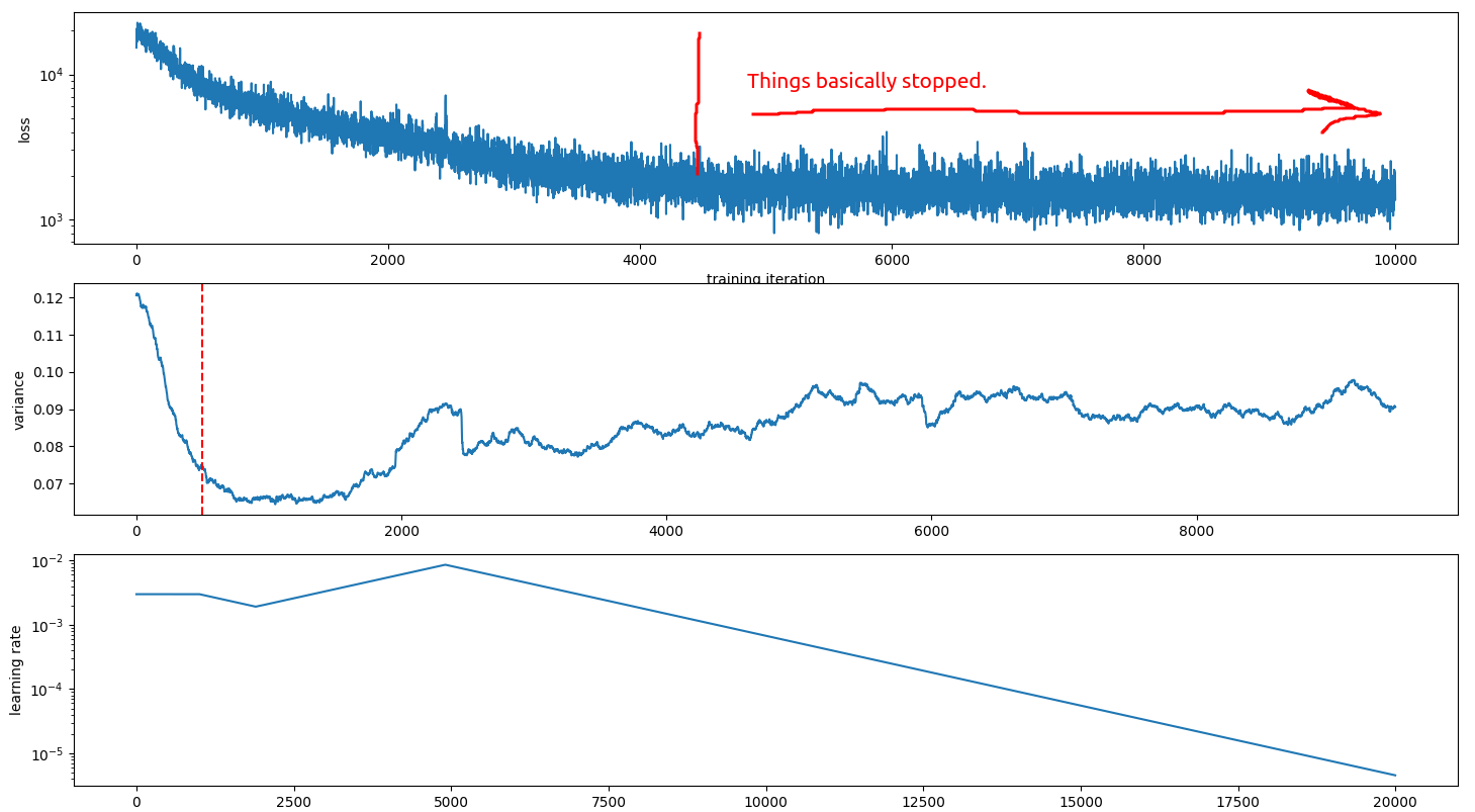 There is a glimmer of hope for this idea still. If we know the variance within the model then we could perhaps subtract that out from the variance due to the too-high learning rate and then use that to adjust the learning rate. We have a batch size of 10k here, so we can get a quite accurate estimate of the models variance over time without too much extra computation.