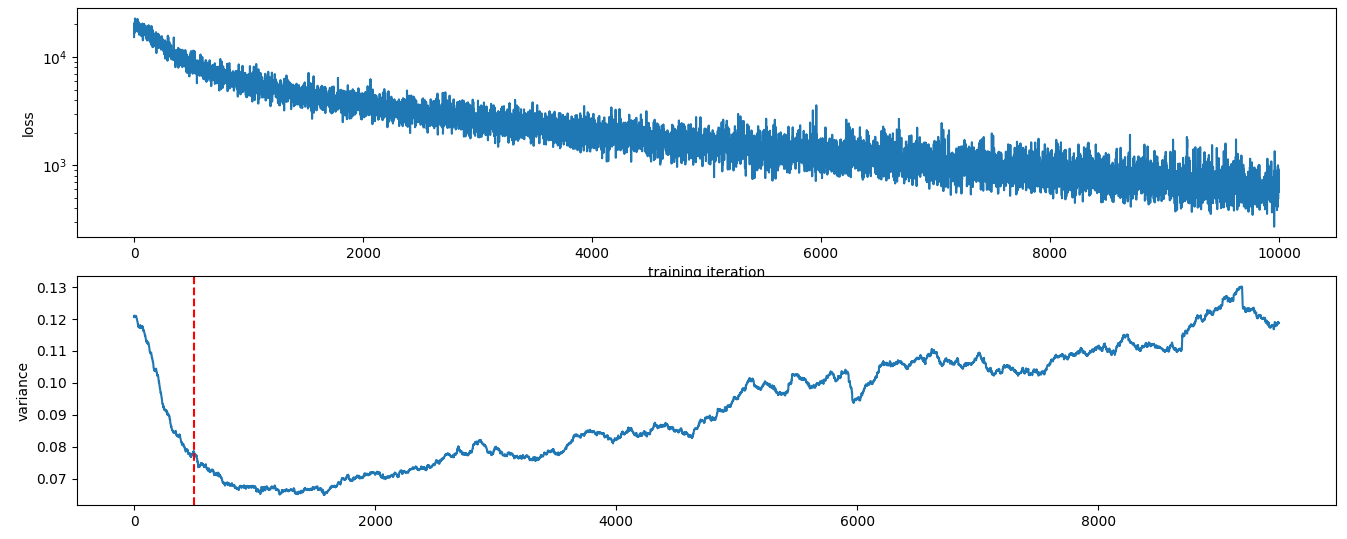 Here is the loss and the variance in the loss plotted as a function of epoch. The loss is calculated as the standardd deviation of the last 500 epochs. It looks like this:
