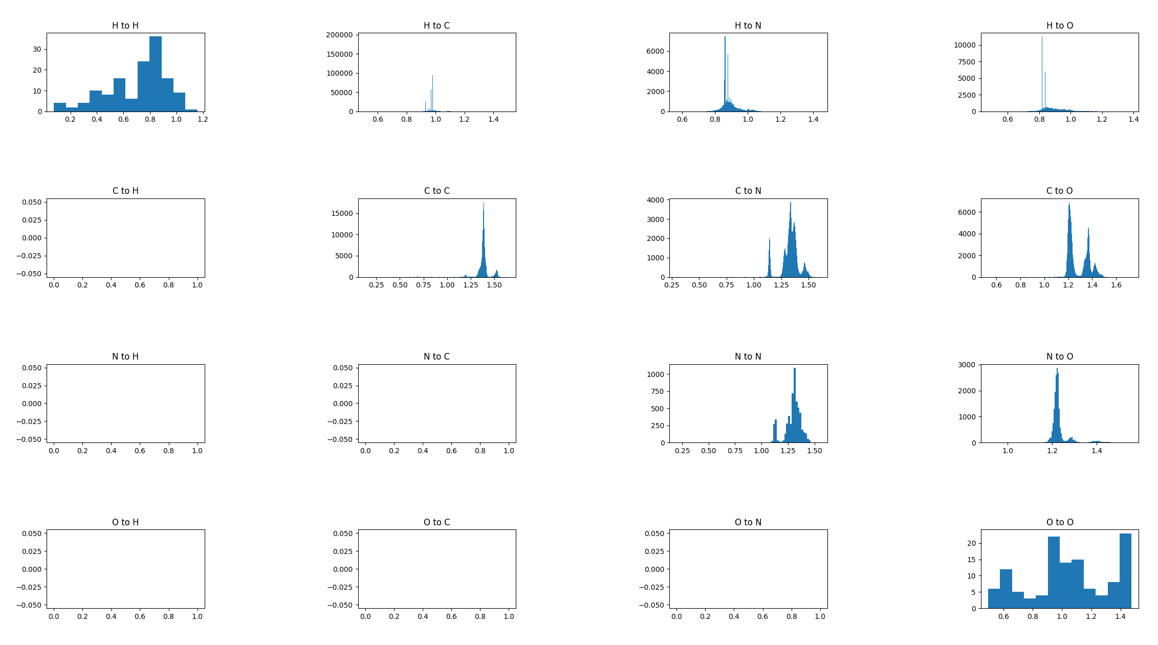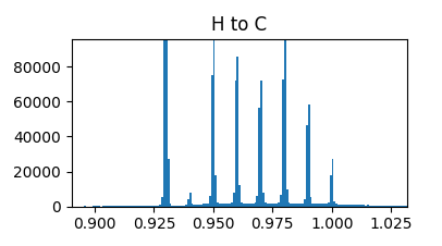 Looks pretty interesting, the nice few-mode distributions all over the place are I presume indicative of double and single bonds and whatnot. There are also a few supposedly impossible things like the H-H bond. The H-C plot doesn’t looks very interesting above but looks like this when you zoom in: