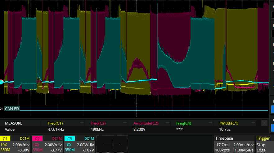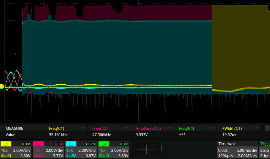 Here is what the motor phases look like when they go from commutation properly to juddering: