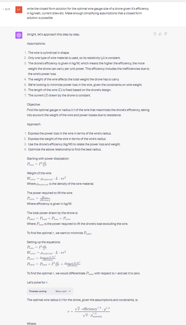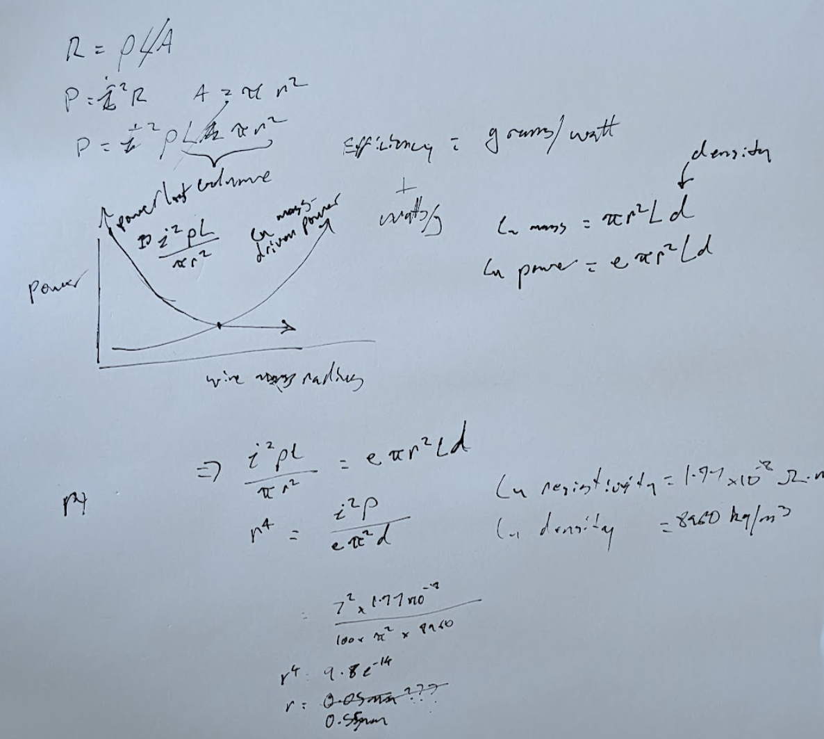 That’s it. Any lighter and the motors would be dissipating excess power. Any heavier and the wires will weigh you down. Notice that huge fourth root there - the wire size goes up very slowly! Don’t forget that the current experienced by a given phase of a motor is battery amps / num motors * 2/3. My optimum wire radius is 0.23mm. When I backcalculate the power dissipated at that diameter with the wire length of my drone I get 200mW which sounds plausible.