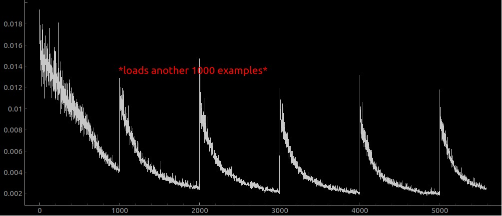 I was training the net on 1000 examples, then reloading a new set of 1000 examples from the scroll every 1000 iterations. That leads to a loss curve that looks like this: