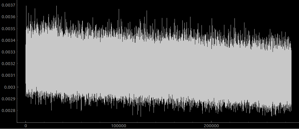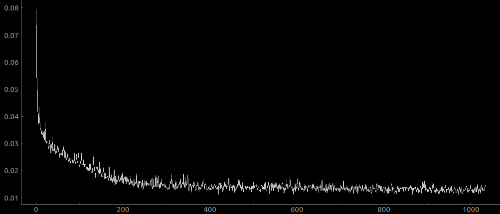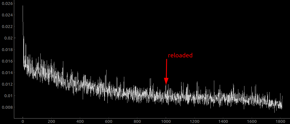 Looks it like it just keeps learning! I was actually busy for a few days after this so let it run even longer, and the loss just kept on dropping. From the y axis you can see that the absolute level of improvement is not that great though.
