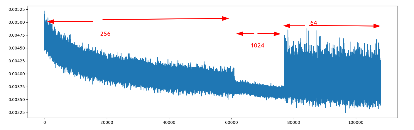 …it doesn’t look like it is having much effect here. Remember in the same time that I do 1 batch-size-1024 iteration I can do 4 of the 256 variant. I’ll keep the experiment running for a bit more just to see what happens though. Given that there was no change in the learning rate from 256→1024 batch size, this clearly means we need to go lower!