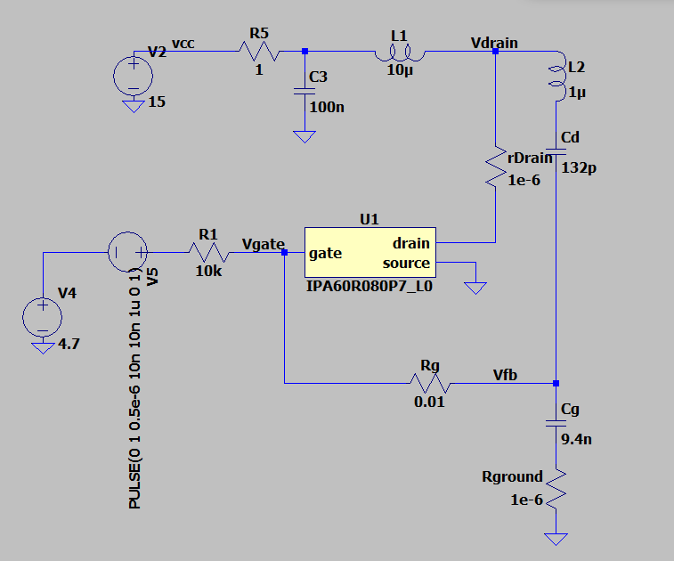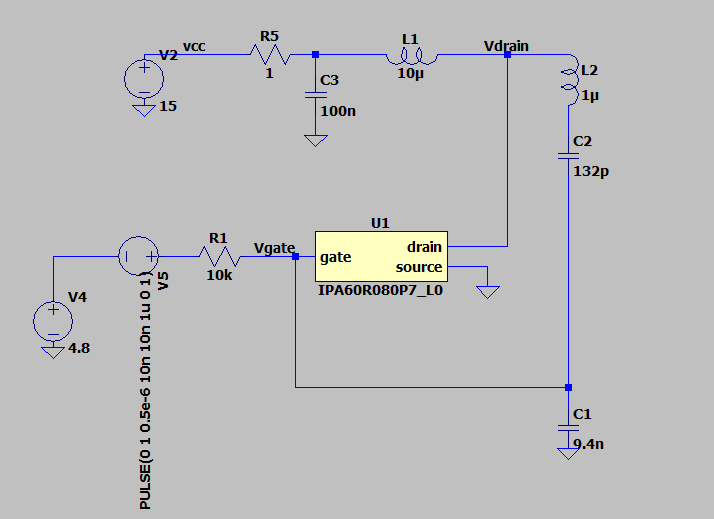 Here I replaced the FET with a IPA60R080P, which has about half the input capacitance. that makes the waveform at the gate look somewhat sensible. Here is a 1000 cycle turnon transient at 11.3MHz: