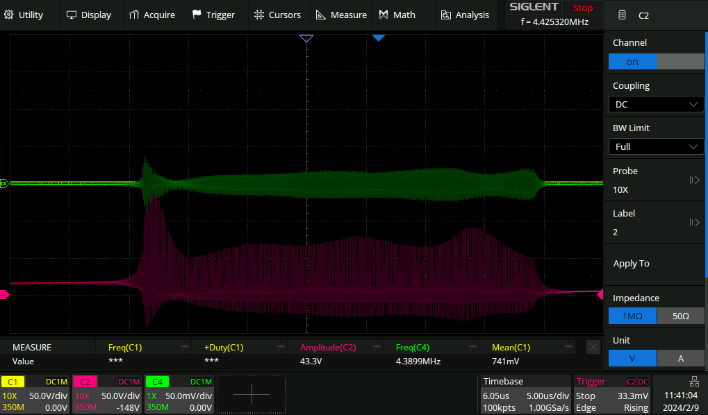 Here I have added the main inductor and capacitor back in, and am probing in between the inductor and capacitor: