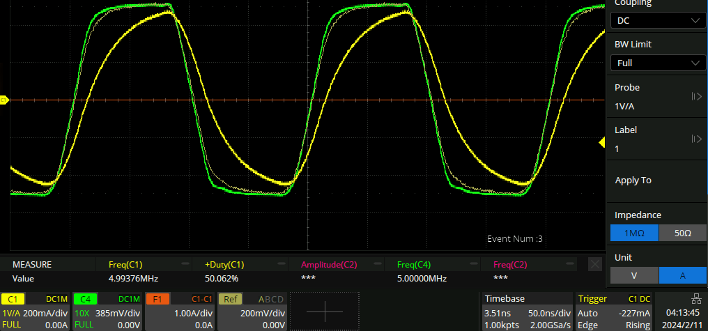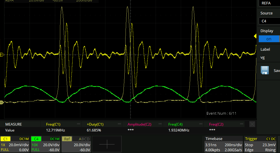 - Yellow is the drain of the FET, probed with the clippy bit of a scope probe.