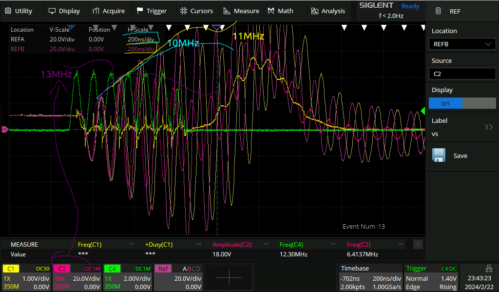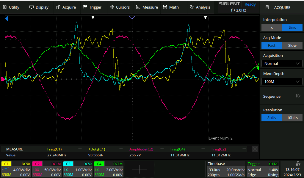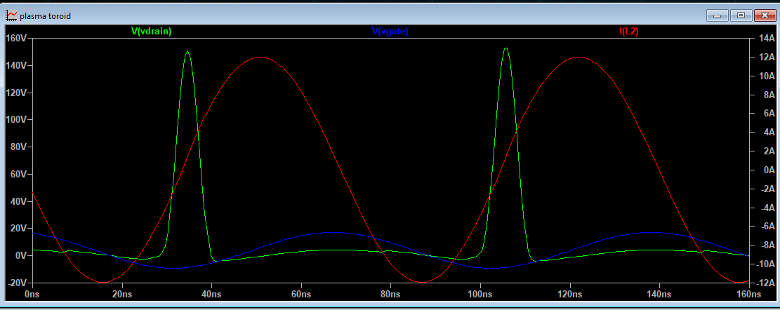 - purple: between inductor and capacitor. The oscillations in the maximum amplitude of the drain and the resonance circuit are real, and I think that might be some oscillating phase shifts as it gets closer and further away from ZVS. Let’s zoom in: