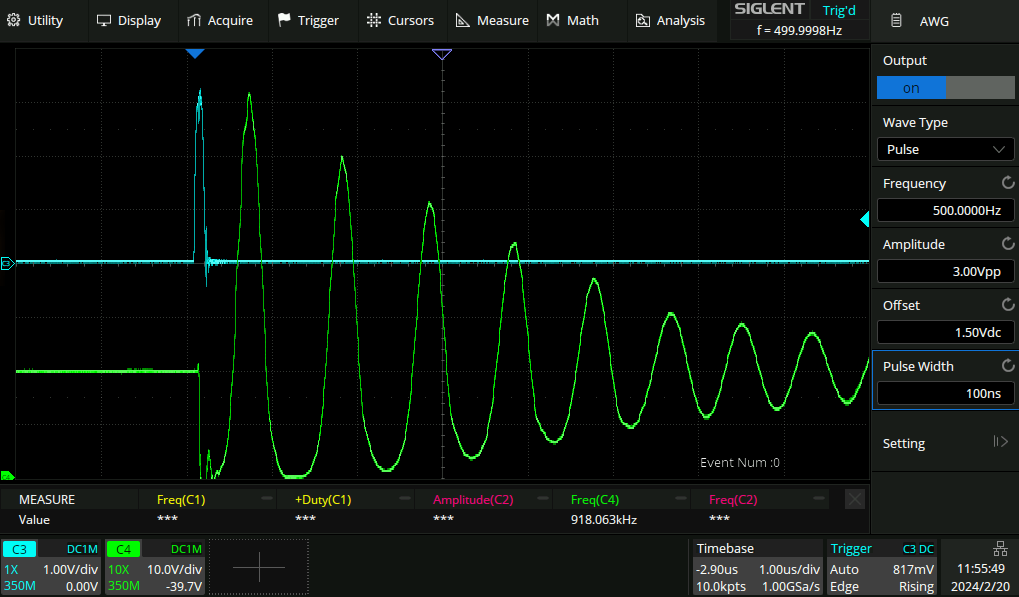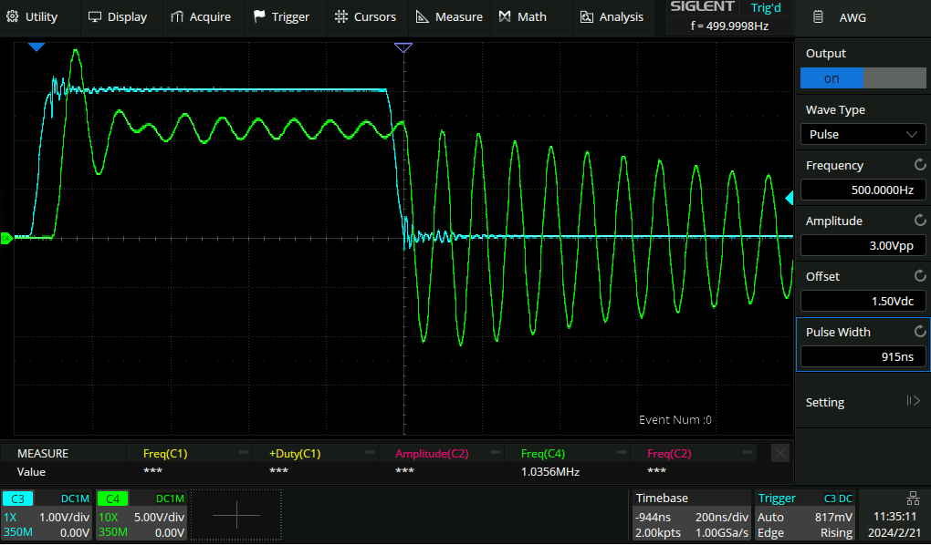 It turns out if you drive the MOSFET driver at 10MHz with this kind of load it burns out after a few 10s of seconds. So I set up the signal generator to generate a pulse train. Here I have tried pulse trains of frequency 10, 11, 12MHz around the resonant frequency of 11.3MHz.